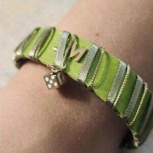 Green ribbon and cording on green faux leather bracelet. This is an Original 30 Day Bracelet by Meskell. Cut a bad habit out of your life or add a good habit one day at a time, one thread at a time. For each day you are successful in doing so, you cut a thread from the bracelet. At the end of the 30 days, you will have a bracelet with the iconic scissor charm to showcase your achievement.