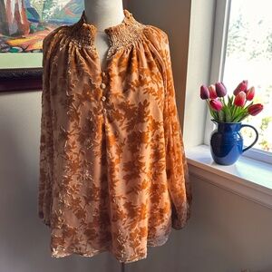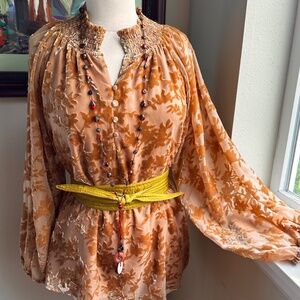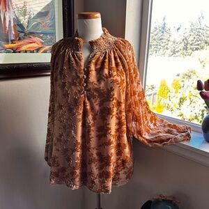 Cut Velvet Amber Colored Peasant Style Smock Top Blouse - S