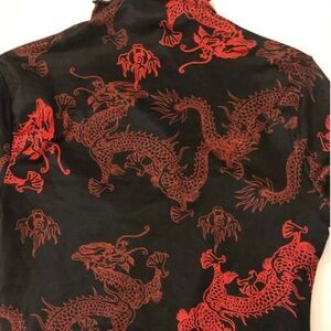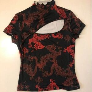 Chinese Style Open Front High Neck Shirt, size S, may also fit some XS. Stretchy material. Pre-worn, no major flaws, stains, or rips. Front has an open section, shows a bit, but not too much. Very cute!