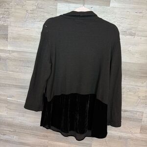 Chic black sweater with a cowl neck. Features a layered velour peplum for added elegance. Ideal for versatile styling. Made in the USA.
