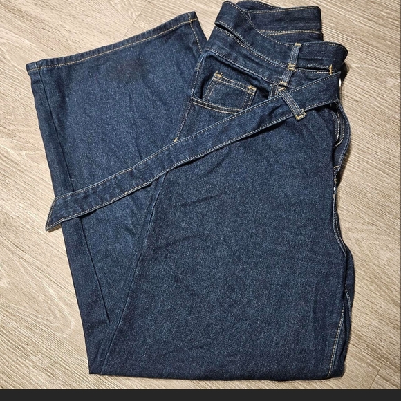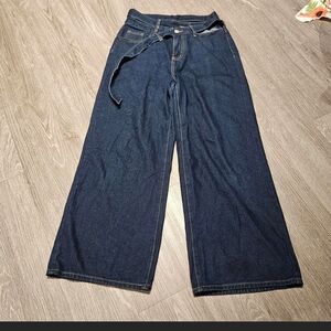 Upgrade your wardrobe with these classic blue denim jeans. Perfect for any casual occasion. Has cut outs on the hips and a long stylish denim belt for the perfect chic look.