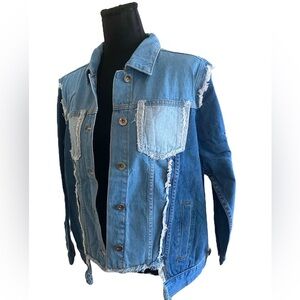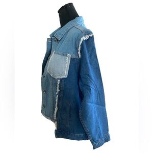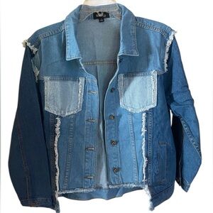 Cut-Out Multi Wash Blue Denim Jean Jacket w/ Fringe Classic Cropped Size L NWOT