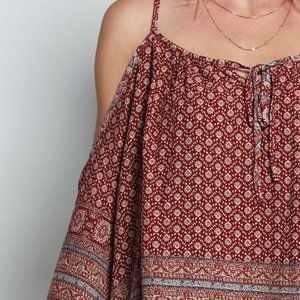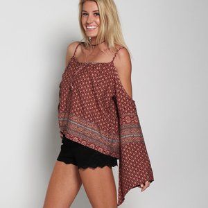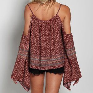 Cut-out shoulder top with long sleeves. Flared cuffs. Front tie detail.