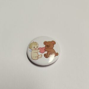Adorable button pin featuring an angel and bear holding a heart. Perfect for accessorizing bags or jackets.