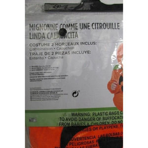 Suit Yourself Costume Co. "Cute As A Pumpkin" 6-12 Months Pumpkin Costume. Orange and Green Velour Jumpsuit with Velcro Back Closure and Leg Snap Closures. Black Felt Create the Jack-O-Lantern Face. Orange, Green and Brown Velour Pumpkin Hat with Velcro Chin Closure.
