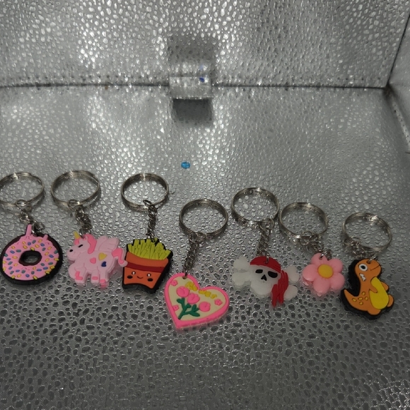 Set of seven adorable keychains featuring fun designs. Includes donut, unicorn, fries, heart, skull, flower, and duck. Perfect for adding charm to your keys. #2
