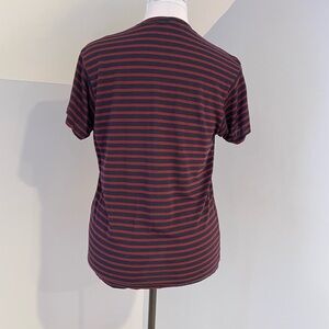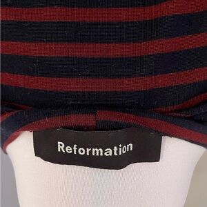 This listing is for a cute striped Reformation relaxed fit crew neck t-shirt. It has navy and maroon stripes. The fabric is microtencel - the material is great for travel as it breathable, soft, and doesn’t wrinkle easily.