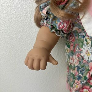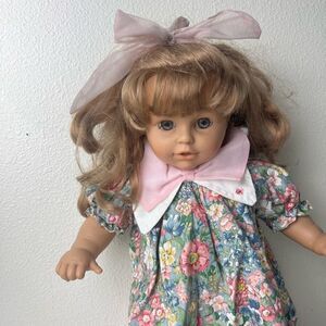 You are bidding on a maybe 1990s era, not sure, Berenguer marked neck, plastic head, arms and legs, cloth body, blonde hair baby girl, in the pictures. 19 inches tall. Very nice shape,