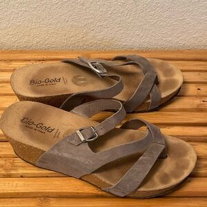 Gray Bio-Gold sandals - gently worn Very comfy with leather sock but manmade upper Wedge heel is about 2 1/4 inch tall