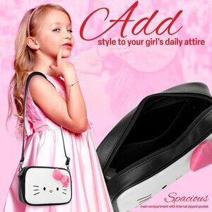 Features: Cute rectangular messenger bag with a graphic Hello Kitty design. It has an adjustable shoulder strap for a comfortable fit, a spacious main compartment, and a secure zipper closure. Inside, there's one pocket for organization. The versatile style makes it great for daily use, school, or casual outings.