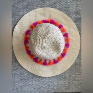 Darling straw beach hat! Floppy brim. White band around hat that is accented with pink and orange stitching and tassels. The straw portion has a faint gold thread woven through it that is beautiful when it catches the sunlight! One size. Excellent condition. Inner band measures about 7” around. Total width about 14.25”.