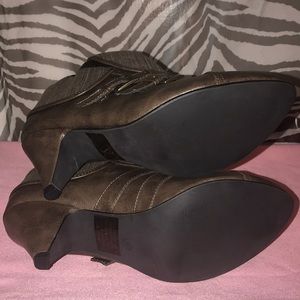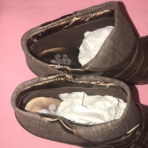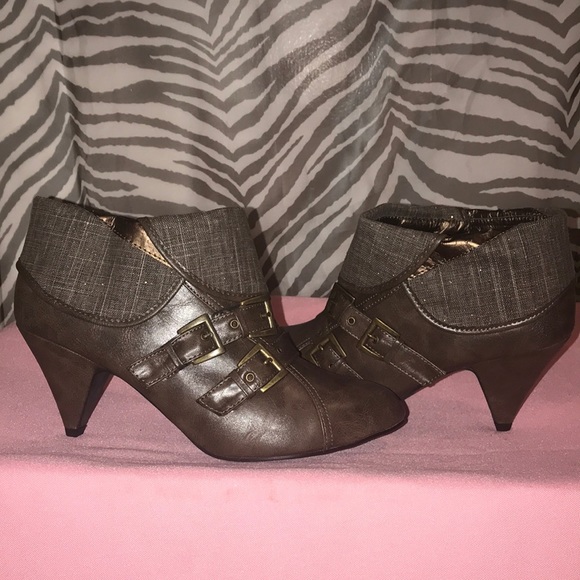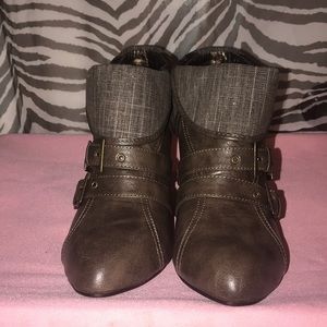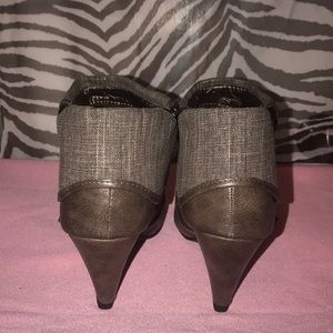 Pewter , brown , gold Bootie , with brown/tan pinstriped detail, and gold buckles ~