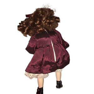Cute Bright Eyed Brunette Porcelain Doll (Sitting Position) - Burgundy Dress and Mary Jane Shoes