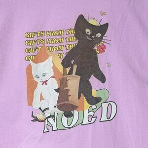 The graphic features cute cats with flowers and butterflies - so whimsical and fun! The soft lavender color is perfect for spring and summer.
