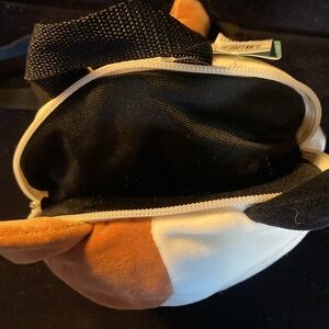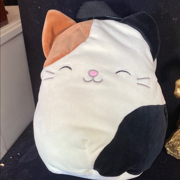 Adorable cat plush backpack. Features a smiling face. Soft and cuddly material. Perfect for cat lovers.
