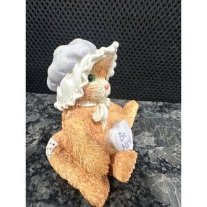 Cute Ceramic Cat Figurines Holding Rose Pink Bow & Green Striped Basket Set