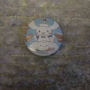 Adorable button pin featuring a cute character with a crown. Perfect for accessorizing bags or jackets. Blue and white design.