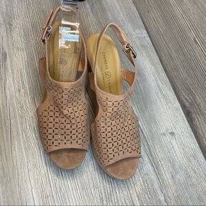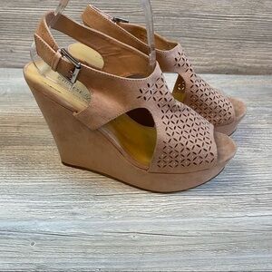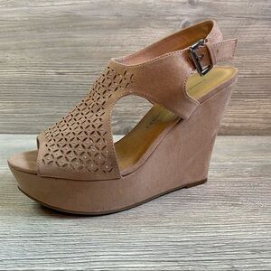 Cute Chinese Laundry peep toe laser cut wedge sandal size 8.5 blush and silver