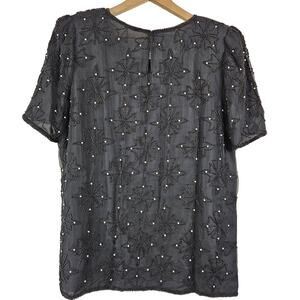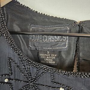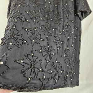Fun sparkly vintage beaded top in an art deco pattern. 100% silk top with rayon lining, short sleeved with shoulder pads. Keyhole closure in back. Perfect party top!