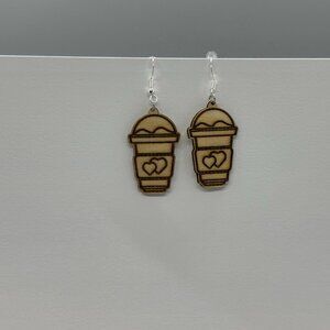 Adorable coffee cup earrings. Features heart accents. Perfect for coffee lovers.