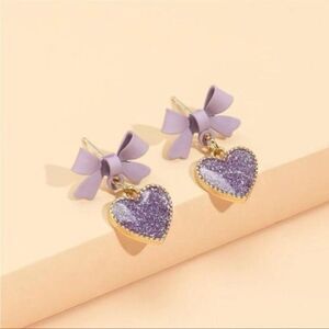 Cute Coquette Girly Purple Ribbon Bow Glitter Heart Shaped Dangle Earrings Jewelry