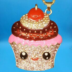 Cute Cupcake Pendant Necklace • Rhinestone Cherry Top • Gift Boxed Kawaii Jewelr
