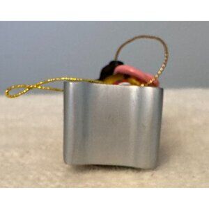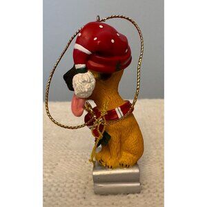 Featured is an Adorable Little Dog Christmas Ornament. The dog is wearing a Santa Hat and Shirt. His tongue is sticking out and shaped into a heart. He is standing on a silver colored bone that says "Wuv U Wots" The ornament is in excellent condition with no chips, cracks, or breaks. Please see pics closely as they are the best indicator of condition.