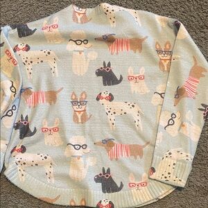 Adorable sweater with a playful dog pattern. Features various dogs wearing glasses. Perfect for casual wear. Across chest is 25 inches wide and is about 27 inches long from shoulder to hem