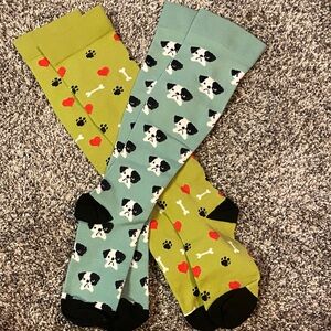 Set of two pairs of compression socks with adorable dog patterns. Women’s size small. Features black, green, and teal colors with heart and bone accents. Brand new. Never worn. Too small for me. Definitely for women with small feet