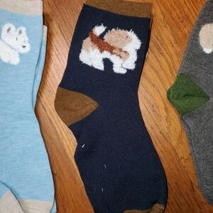These socks are 90% Polyester and 10% Spandex. Each pair features a different type of dog.