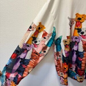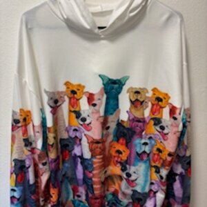 Cute, colorful and vibrant dog/puppy hoodie. It is made very well, no loose threads and breathable material. This hoodie is a stand out one of a kind item. Almost reminds me a little of the Disney movie, Secret Life of Pets. Size Large