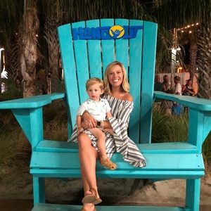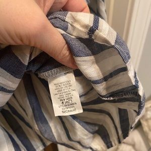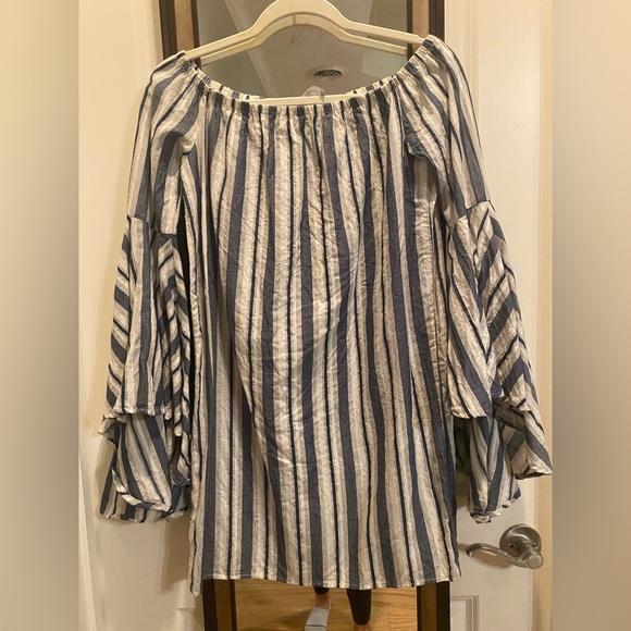 Navy stripped stress. Fits true to size. Flare sleeves. Can be worn off the shoulders. Beautiful summer dress!