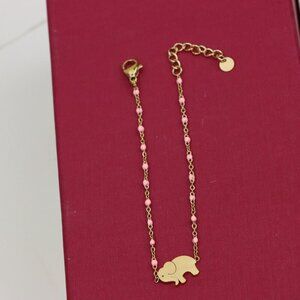Adorn your wrist with this charming yellow bracelet featuring a sweet elephant charm and delicate pink beads, perfect for everyday elegance. Crafted with gold plated high quality brass for lasting beauty and durability.
