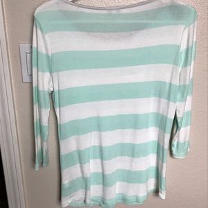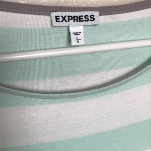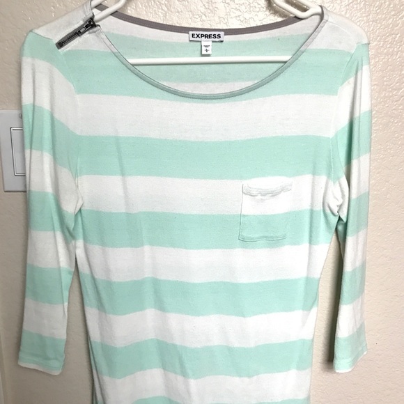 Striped mint and white Express tee with cute zipper detail on the shoulder and 3/4 sleeves. Light weight and cute for summer paired with shorts!! EUC, no stains or tears.