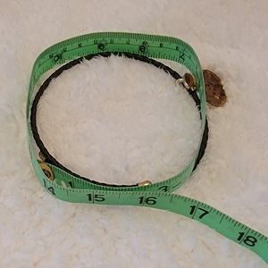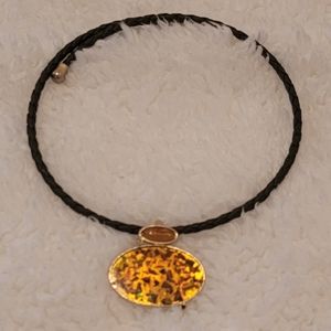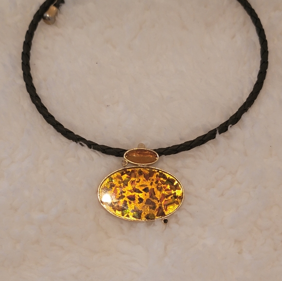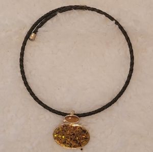 Cute choker in brown with gold colored tips and orange and brown and gold pendant. Works like a headband, no latches, etc, stays in place on its own. Very cute!