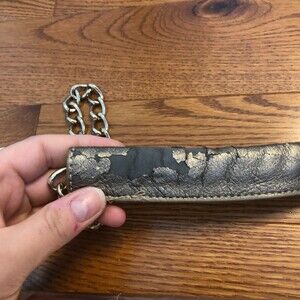 Golden chain, comes with handle, leather on the handle only is peeling a bit, but can be easily taken off.