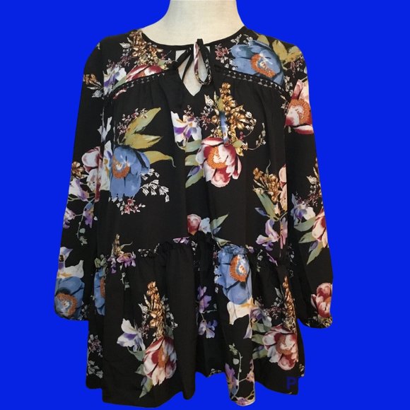 Cute Floral Baby Doll Blouse Crew Neck Keyhole Tie Closure Ladies Size Large