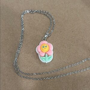 Adorable flower pendant necklace with pink, yellow, and green colors. Perfect for adding a playful touch to any outfit. Extra large class for small hands.