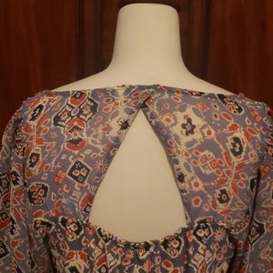 Really cute jersey knit top with sheer flutter sleeves, and sheer, cutout top, in back. Pretty floral/tribal type print. Soft heather blue with rust, beige and pale yellow throughout. Very comfortable fabric, and can be dressed up or down.