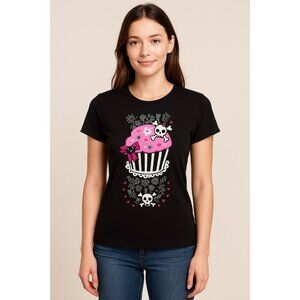 gothic cupcake shirt, skull t-shirt, kawaii goth top, punk cute tee, pastel goth style, emo fashion shirt, next level graphic tee, pink skull shirt, black novelty shirt, Y2K gothcore, alternative streetwear top, cupcake graphic tee