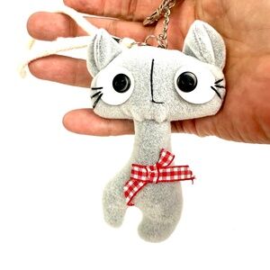 Add a touch of adorable charm to your keys, backpack, or purse with this soft gray plush cat keychain! Featuring oversized eyes, embroidered whiskers, and a red gingham bow, this little cat is perfect for animal lovers and anyone who enjoys cute accessories. Comes with a sturdy metal keyring and white wrist strap for easy carrying.