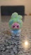 Adorable fuzzy figurine with a green and white costume. Features pink and blue accents.