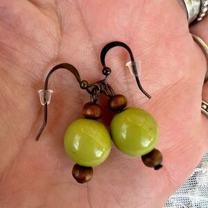 Cute Green Bead & Wood Drop Earrings