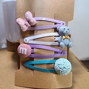 Adorable set of four hair clips designed to add a touch of whimsy to any hairstyle. This collection features a variety of playful designs, including a polka dot bow, a teddy bear with a bow tie, an M&M candy, and a textured sphere. The clips are perfect for keeping hair neatly in place while adding a fun, decorative element. Ideal for everyday wear, school events, or birthday parties, these clips are sure to delight.