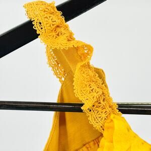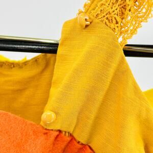 Excellent condition. Handmade felt feather costume sewn onto a Tommy Bahama little girls’ yellow dress base. Features layered multicolor felt feathers, oversized cartoon eyes, and playful lace straps. One of a kind piece.