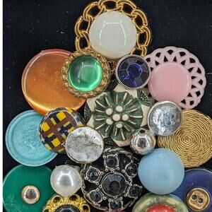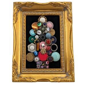 Cute little Christmas Tree made out of vintage & modern buttons beads & jewelry bits (plastic glass & metal) which have been glued onto a black velvet background. Gold gilt modern tabletop frame. In very good condition - there are a few areas where the glue can be seen but it's not obvious. Frame is 6x8 inches; artwork about 3.5x5.5 inches.