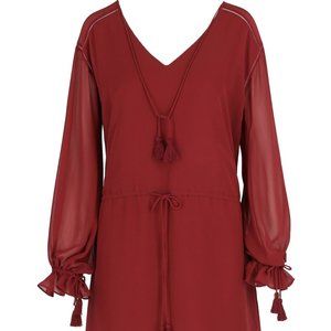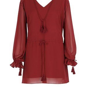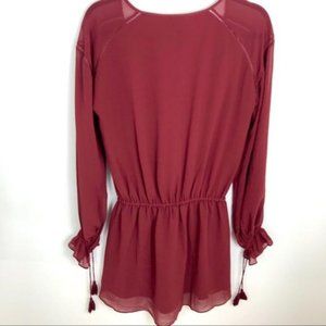 Cute Fun And Easy Haute Hippie Boho Peasant mini dress in merlot burgundy with tassel accents.