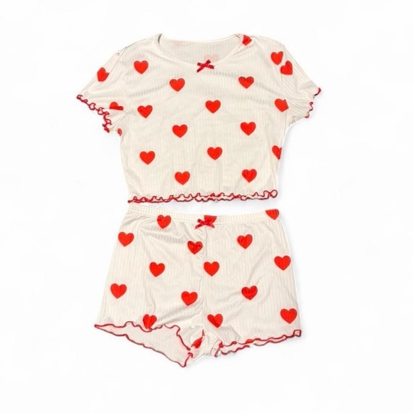 adorable heart pattern set! unsure of the brand, but kinda thin and see-through. sized as an M but can fit an S!