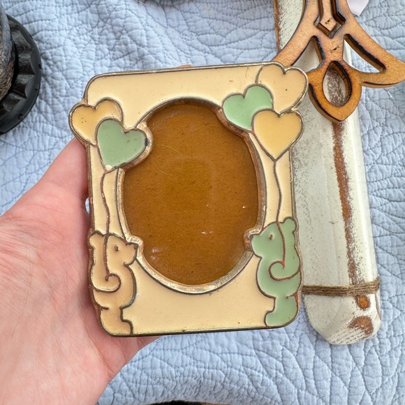 Adorable picture frames with heart and bear design. Features cream and green colors.