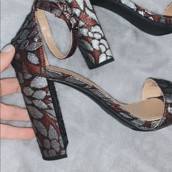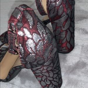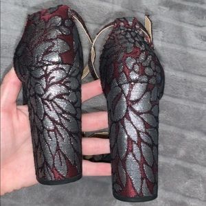 3-3.5 inch heels!!! so cute. metallic detailing. color is maroon.